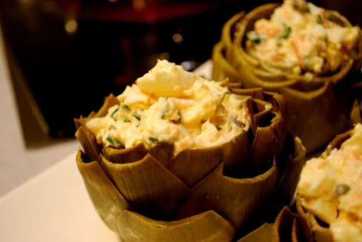 To serve, spoon dressing into two bowls (easier) or into chokes themselves (messier) and serve.