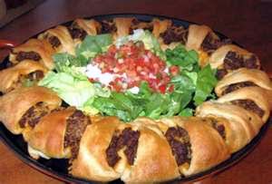 Preheat oven to 375. Combine meat, taco seasoning, cheese and water. Arrange crescent triangles in a circle with bases overlapping in center and points to the outside (about 5” diameter circle in center). Spoon meat mixture over rolls. Fold points of triangles over filling and tuck under base at center (filling will not be completely covered). Bake 20-25 minutes or until golden brown. Put garnish items in center of Taco Ring. Enjoy!