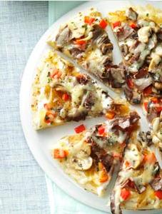 Place crust on a pizza pan; spread with French onion dip. Layer with mozzarella cheese, onion mixture, red pepper, mushroom mixture and Gruyere cheese.
