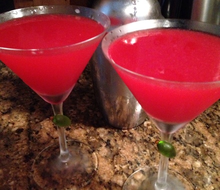 In a shaker over ice, mix 2-3 T cranberry syrup, 3 T silver tequila, 2 T orange liquor (not triple sec!) juice of 1 lime and a squeeze of agave nectar. Pour into chilled martini glasses. Cheers!