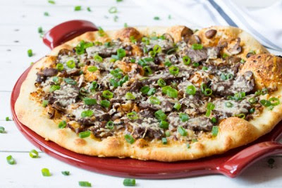 Re-stretch the pizza crust and spread a thin layer of spicy mustard over the top of the crust. Then spread the sauteed onions and mushrooms over the mustard. Place pieces of thinly sliced steak over the mushrooms, followed by a sprinkle of parmesan cheese.