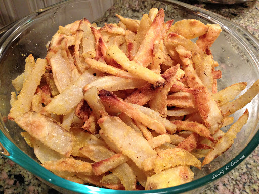 Sprinkle cornstarch and cornmeal and toss until each fry is coated.