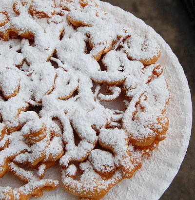 3. Using a funnel with a 1/2"–1/3"- wide spout, block funnel's spout hand, pour 1/3 cup of the batter into funnel mouth. Holding funnel about 5" above the hot oil, release your finger to open the spout, letting batter fall into oil, and quickly move funnel around, making circles and crisscrosses with the batter in the oil. Fry until batter is golden brown on each side, turning once, 30–45 seconds per side. Transfer funnel cake to paper towels to let drain, then dust with confectioners' sugar. Repeat process with remaining batter and confectioners' sugar, making 10–12 funnel cakes in all. Serve warm.