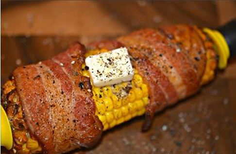 Hot, oven roasted corn topped with butter, salt and pepper and wrapped with crisp bacon.