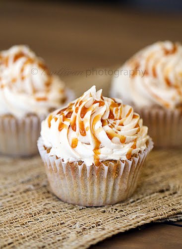 Pipe frosting on cupcakes. Drizzle with caramel sauce.