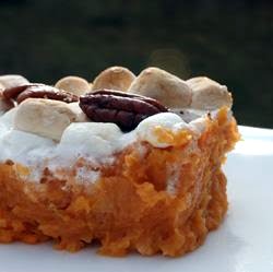 Coat a 9 x 9 inch baking dish with cooking spray and spread the sweet potato mixture evenly throughout the dish. Top with the marshmallows. Personally, I think I had too many marshmallows on mine (just a bit too may). I would have one layer of marshmallows - no extra. Place the pecans on top with plenty of space between them.