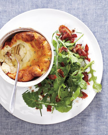 Whisk together oil and vinegar; drizzle over arugula. Season to taste. Top with bacon and chive pieces, and serve with souffle.