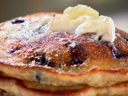Heat a large skillet or griddle over medium heat and coat with some of the remaining melted butter. For each pancake, pour about 1/4 cup of the batter into the hot skillet. Cook 3 or 4 pancakes at a time, depending on the size of the skillet. If the batter seems too thick, thin it with 1 to 2 tablespoons milk. When bubbles begin to form and "pop" on the pancake's surface, after about 1 minute, and the outer edge looks done, flip it over and cook briefly for about 30 seconds on the other side.