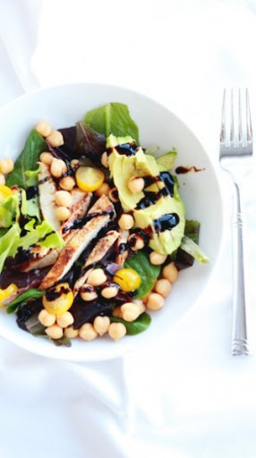 If making the balsamic reduction, heat 2 cups of balsamic vinegar and ½ cup of brown sugar in a saucepan. Stir and heat until the sugar dissolves, then reduce the heat to low and cook down for 20 minutes until it becomes thick. Butterfly the chicken breasts and season them generously with the spices, coating each side. Grill or cook the chicken in a sauté pan. Let the chicken cool, then slice each breast into thin strips. To make the salad, top the mixed greens with the tomatoes, chickpeas, and grilled chicken. Drizzle with olive oil and a splash or two of red wine vinegar. Add the sliced avocado, then drizzle everything with the balsamic glaze/reduction. Finish with salt and pepper across the top.
