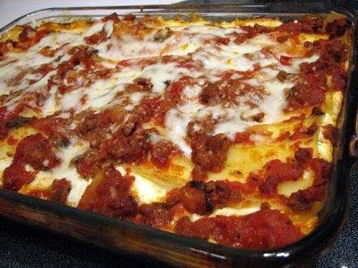 I've been seriously craving lasagna. Rich ooey gooey layers of cheese, pasta and meat sauce, nice and bubbly hot with the cheese strands stretching tenaciously from plate to fork. So I wanted lasagna, but without the extra step of boiling the noodles first and then layering the hot, eel-like strips in the pan. I'd bought some of the Ronzoni Oven-Ready Lasagna noodles as test to see if they made life any easier or if they were destined to become one of those things that sounds better than it is.