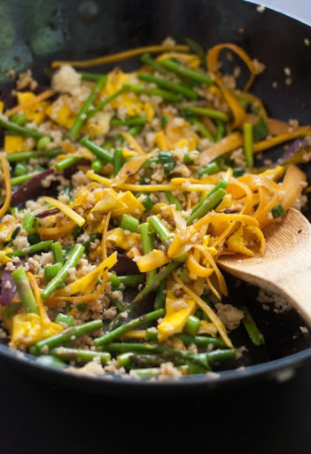 This stir-fried millet with seasonal vegetables is comforting, delicious and filling. It’s perfect for rainy spring days. I used asparagus and carrots here, but feel free to substitute sliced broccoli, bell pepper strips, or any other thinly sliced vegetable.