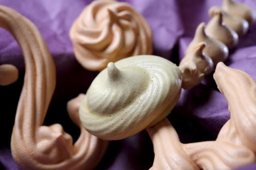 3. Place the meringue in a pastry bag with a star point. Get a 12''x17'' baking tray, place wax paper on the bottom, and begin to form 16 pieces in curl shapes.