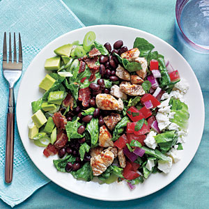 3. Arrange 2 cups lettuce on each of 4 plates. Top each serving with about 2 teaspoons bacon, 5 tablespoons turkey, 2 tablespoons pico de gallo, 2 tablespoons avocado, 2 tablespoons queso fresco, 1 tablespoon onions, and about 1/3 cup beans. Drizzle vinaigrette evenly over salads.