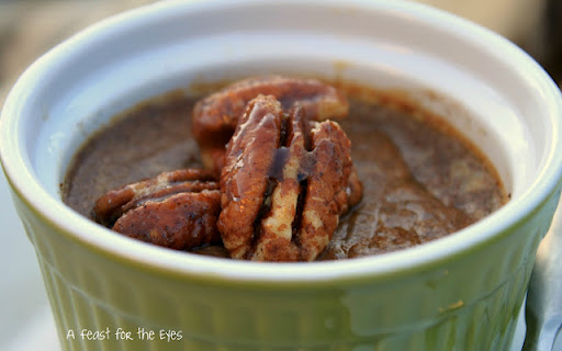Pots de Crème are very much like a Brulee, except there isn't that crunchy sugar that is done with a blow torch. These are easily made with a whisk, and gently baked in a water bath. The candied pecans are a nice touch, but not mandatory. These are like naked pumpkin pie (no crust). Just the right balance of sweet, perfect to welcome Fall. Recipe comes from "Baking Obsession".