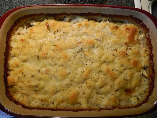 Using the same bowl, whisk together 2 cups chicken broth, cream of celery soup, sour cream and savory. Carefully pour this mixture over top of chicken and flour mixture.