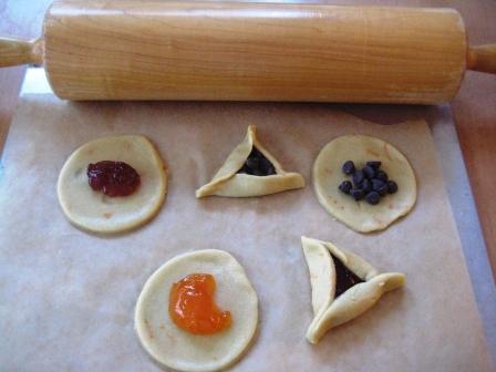 9. Put approximately 1 teaspoon of filling (see options below) in the center of each circle. Fold up the sides of the circle to form a triangle (symbolic of Haman’s three-cornered hat). Leave an opening at center of the triangle to let the filling peek through. Pinch edges together to prevent filling from leaking out.