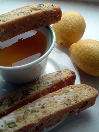 Take a serrated knife and cut each roll diagonally into 1/2 inch slices. Place slices cut side down on the cookie sheets. Lower the oven to 325 degrees F.. Bake biscotti for an additional 8 minutes and remove from oven. Turn each slice over and return to the oven for a final 9-10 minutes, or until dry and crisp (be careful not to burn them!).