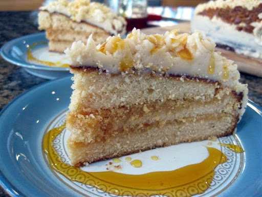 Cut the cake horizontally into three pieces. Brush each layer off to ensure no crumbs remain behind, and brush each layer liberally with caramel syrup. The syrup is easier to work with when hot, so warm it up in the microwave for 30 seconds if need be. Put the cake back together and add the frosting to your desire. I simply smoothed out the sides, and then piped on a random design on the top. You can crunch up some of the homemade caramels as well and sprinkle them on top. After you slice it and place on a plate, drizzle with a little caramel syrup for presentation.
