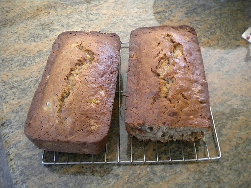 1. In a large bowl combine flour, sugar, baking soda, and cinnamon; stir in nuts. Set aside. Combine remaining ingredients in another mixing bowl; blend well. Pour wet ingredients into dry ingredients and stir until just moist. Pour into 2 greased and floured loaf pans.
