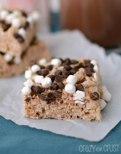 Working quickly, spray your hands with cooking spray so they won’t stick to the mixture, and carefully press the treats into the pan. (Be careful - the mixture will be hot.) Sprinkle immediately with Mallow Bits and mini chocolate chips and press lightly to secure them to the top of the krispie treats. Let cool completely before cutting into squares.