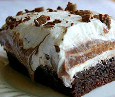 Blend puddings and milk together and put on top of the cream cheese mixture. Top with another layer of whipped topping. Put chocolate shavings or chocolate syrup on top.