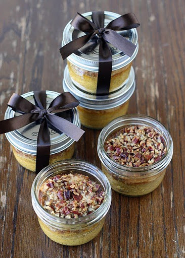 8. Bake jars on a large baking sheet (so they are easy to put in and out of the oven) for about 40 minutes, until toothpick inserted in the center of a jar comes out clean, and dessert is golden brown.