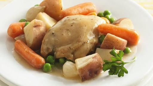 Spray 3- to 4-quart slow cooker with cooking spray. In cooker, place potatoes, carrots and thawed onions. Sprinkle chicken with salt and pepper; place over vegetables in cooker. Pour gravy over top.