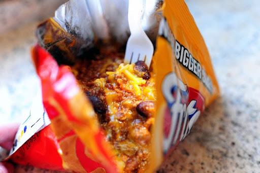 Serve by slicing the Frito bags open lengthwise. Pile in chili and cheese, and diced onion if using. Serve immediately with plastic forks. A crowd-pleaser!