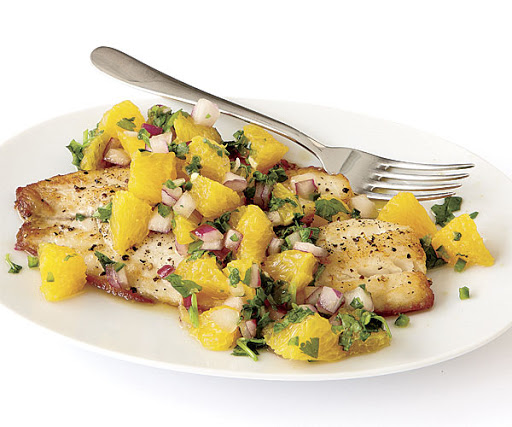 Pat the fish dry and season with salt and pepper. Heat the oil in a 10-inch nonstick skillet over medium-high heat until shimmering hot. Cook 2 of the fillets, flipping once, until browned and just cooked through, 1-1/2 to 2 minutes per side. Transfer to dinner plates. Repeat with the remaining fillets. Using a slotted spoon to drain excess juice, top the fish with the salsa and serve.