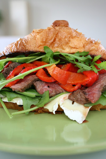 Heat a large nonstick skillet or griddle over medium heat. Using a serrated knife, slice the croissants in half lengthwise. In 2 batches, place the croissant halves, cut side down in the skillet and cook for 30 seconds to 1 minute until lightly toasted. Lay the Brie slices over the toasted croissant halves. Place about 1/4 cup of the arugula on the bottom halves of the croissants. Add the sliced steak. Arrange the red bell pepper on top of the steak. Top with the remaining arugula and add the top of the croissant. Serve immediately.