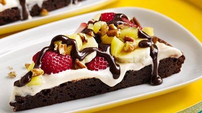 1. Heat oven to 350° F (325° F for dark or nonstick pan). Spray or grease 12-inch pizza pan. Make brownies as directed. Spread in pan.
