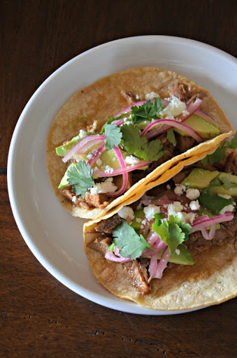 Place desired amount of pork into tortilla and top with avocado, cilantro, pickled onions and cotija cheese.