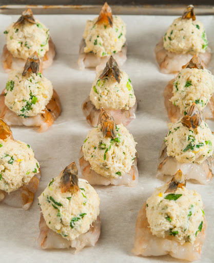 Open the incision in each shrimp and pipe a ribbon of the ricotta mixture into each opening. Arrange the shrimp on the lettuce-lined platter and serve.