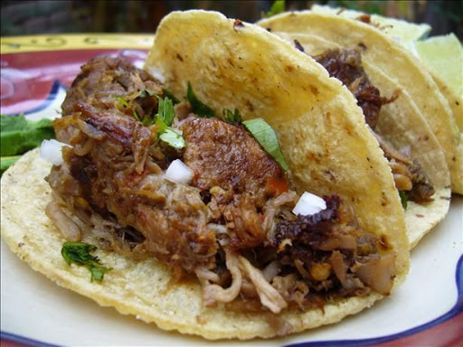 1 Trim any thick fat from the outside of the pork butt. Cut the meat into 1-inch cubes. Discard any cubes that are pure fat, but don't try to trim all of the fat out of the meat. 2 Put the pork in a large pot. Add the water the strips of orange zest, garlic, onion, red pepper flakes, cinnamon, bay leaves, oregano, 1 1/2 teaspoons salt and cloves. Bring to a boil then reduce to a simmer. Skim off any scum that forms on the surface. Simmer for 1 1/2 hours, until the pork is very soft, adding more water if necessary to keep the meat submerged. Season with salt. 3 Bring to a gentle boil and cook until the water has evaporated about 30 minutes. Cook a little longer to fry the meat slightly. (Note: if you want extra-crispy carnitas, fry approximately 25 minutes.) Watch carefully to prevent burning. 4 Remove the bay leaves and cinnamon sticks. Put the meat in a fine strainer and push gently with a wooden spoon to remove any excess fat. Discard the fat. 5 Fold a few tablespoons of carnitas inside each tortilla and top each taco with cilantro, onion and salsa.