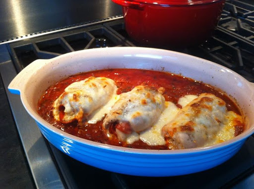 Bake for 20 minutes, if normal sized breasts, 25 if they are the really large kind. Remove and layer the top of the chicken with mozzarella. Put back in the oven on the highest rack and bake another 8 minutes or until the top of the mozzarella has begun to turn golden. If need be, you can kick the broiler on to help it along.
