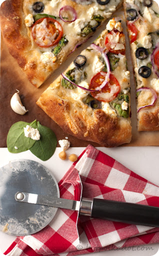 Spread an even layer of the Summer Fresh Garlic Hummus over the pizza dough. Sprinkle half the mozzarella on top followed by the spinach leaves, onion, tomatoes, olives, the rest of the mozzarella and finally the feta cheese.