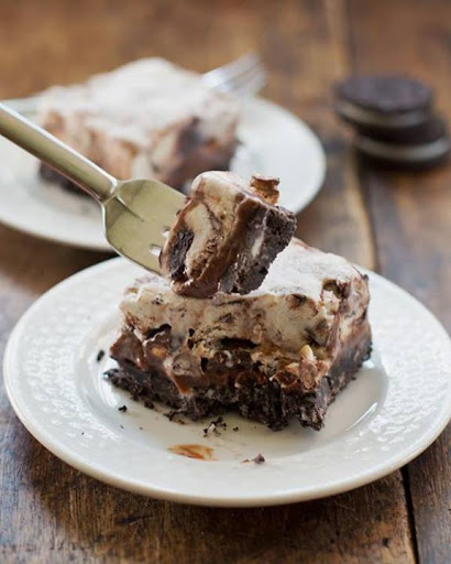 Assembling: Pour the fudge sauce over the crust. Allow to rest for a few minutes so the fudge sauce continues to cool. Scoop the softened ice cream over the crust and spread or press gently to create an even top layer. It’s a little messy – that’s ok. It doesn’t have to be perfectly smooth. Freeze again for a few hours or until solid. When you’re ready to serve, let the pan sit out for 10 minutes so it softens. This makes it easier to cut and eat.