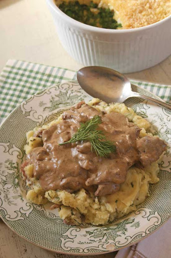 Increase heat to medium and stir in garlic, flour, seasoning and Worcestershire sauce; cook for 3 minutes, stirring constantly. Gradually stir in milk, whisking to break up any clumps. Cook, stirring frequently, for 5 to 10 minutes, or until mixture boils and thickens. Season with salt and pepper. Serve over mashed potatoes.