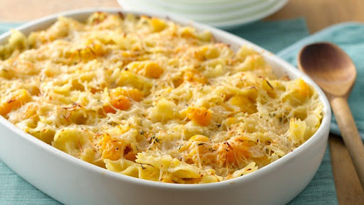 Using frozen winter squash is an easy way to add flavor and nutrients to this creamy bow-tie pasta dish.