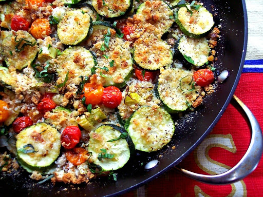 Place in a hot oven at 425 till tender and crispy and the tomatoes pop and get caramelized, you could even place it under the broiler at the end to crisp up the top more, The imported romano cheese, the tomatoes ( you must use cherry tomatoes, please) the homemade breadcrumbs and those caramelized onions paired with the zucchini, I'm telling you I could almost become a vegetarian!