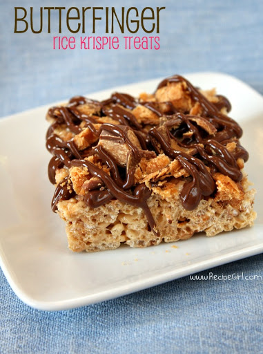 2. In a large saucepan, melt the butter and peanut butter together over medium heat. Add the marshmallows- stir until melted. Remove from heat and stir in the Rice Krispies. Stir in the Butterfingers (setting about 1/4 cup aside for the topping). Scrape the mixture into the prepare pan and press it evenly into the pan with clean hands. Let it cool.