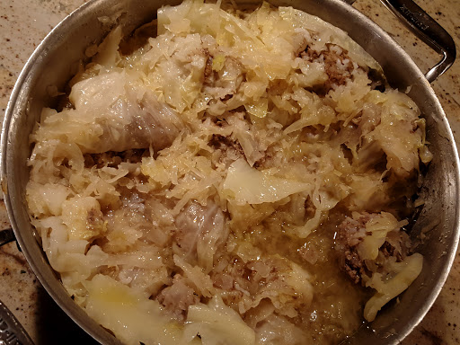 Layer rolled cabbages on top of the sour kraut, and repeat layers until the kettle is full.