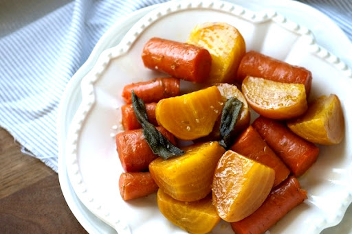 Add to a roasting pan and toss with the smashed garlic, sage, rosemary, olive oil, white wine vinegar and a pinch of salt. Place into the oven and roast for about 30 minutes. The beets and carrots should become slightly golden.