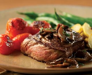 A brandied mixed mushroom sauce tops seared strip steak in our healthy version of the classic dish Steak Diane. Serve with garlic mashed potatoes and steamed green beans.
