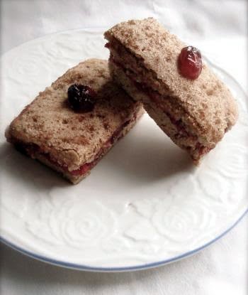 Remove the top piece of parchment paper and spread enough cranberry jelly to cover half of the rectangle. Fold the plain side on top of the side with the jelly to create a smaller rectangle.