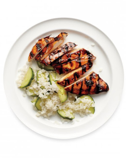 In a small saucepan, combine soy sauce, honey, 1 tablespoon rice vinegar, and garlic; bring to a boil and reduce by half. Toss together rice and cucumber; dress with 5 tablespoons rice vinegar and sesame oil; season. Grill chicken, brushing with soy glaze and turning often. Serve chicken with rice salad.
