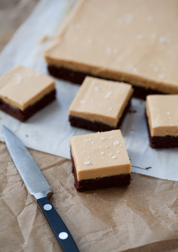 To prepare the frosting, cream the butter and the peanut butter until combined. Slowly stir in the powdered sugar until completely incorporated. Spread over cooled brownies and sprinkle with flake salt (Maldon) or Fleur De Sel. Cut into squares.