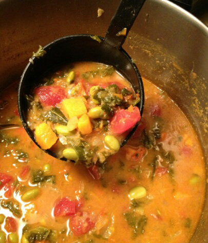 3. Add broth and sweet potatoes and bring to a boil. Reduce heat to low and simmer about 8 minutes. Stir in edamame and peanut butter until combined. Cook until thoroughly heated, about 2 minutes. Stir in cilantro and spinach until spinach wilts. Season with salt and pepper.
