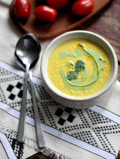 3. Once the corn is cooked, remove pot from heat and transfer the soup to a blender, reserving a few tablespoons of the whole corn kernels for garnish. Add soaked and rinsed cashews. Blend on high until completely smooth. Add water to thin, if desired. Season to taste. Return soup to the pot to keep warm if necessary. Serve with cilantro cream, a drizzle of olive oil, a few kernels of corn and plenty of cracked black pepper.