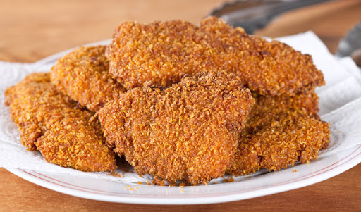 This fried chicken is sinfully good. The brining makes it extra juicy and the cornflake coating adds a delicious sweet crunch.